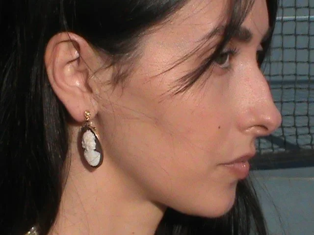 Vintage cameo carving on a dark pendant with faux pearl details and metal frame. Can be threaded onto earring.